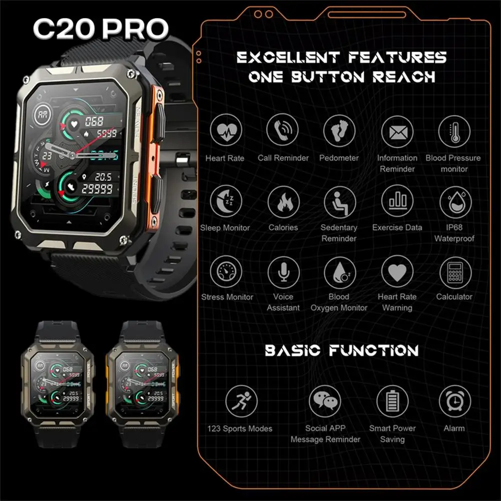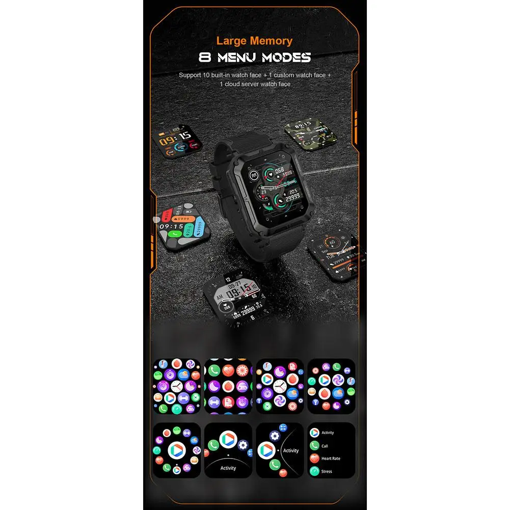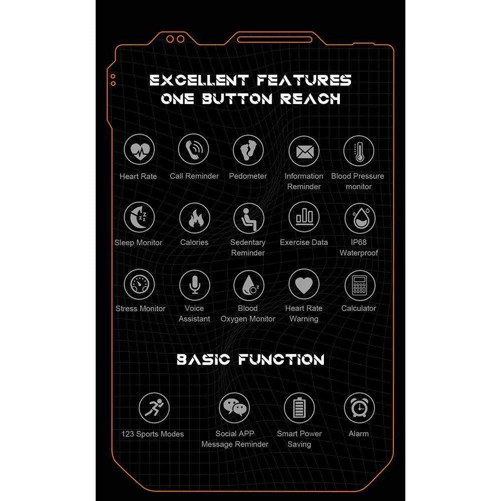 Functions: Dialing, Frequent Contacts, Call Records, Pedometer, Sleep, Heart Rate, Exercise, Blood Pressure Weather, Camera Control, Blood Oxygen, Music Control, Stopwatch, Alarm Clock, Timer, Sedentary Reminder, Breathing Training, Calculator, Messages, brightness adjustment, mute, QR code, quick center, phone search, heart rate alarm, voice assistant, stress monitor;
