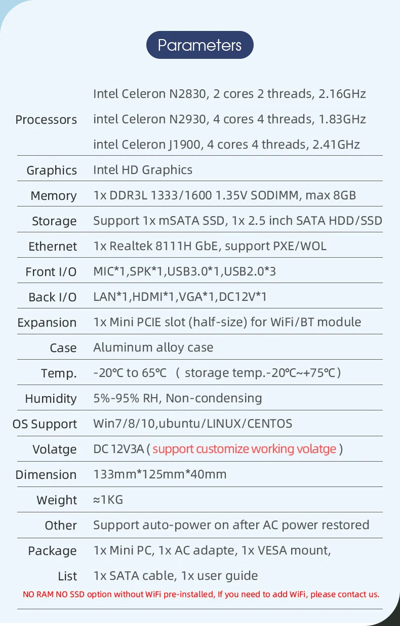 Intel Celeron Processor N2830, 1M Cache, 2 cores 2 threads, 2.16GHz, up to 2.41GHz; Intel Celeron Processor N2930 , 2M Cache, 4 cores 4 threads, 1.83GHz, up to 2.16GHz Intel Celeron Processor J1900, 2M Cache, 4 cores 4 threads, 2.0GHz, up to 2.42 GHz;  |