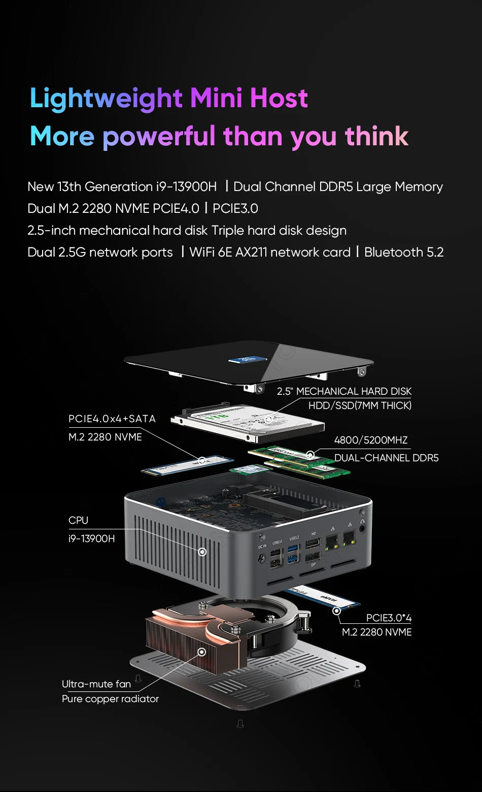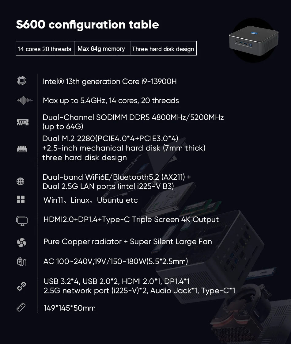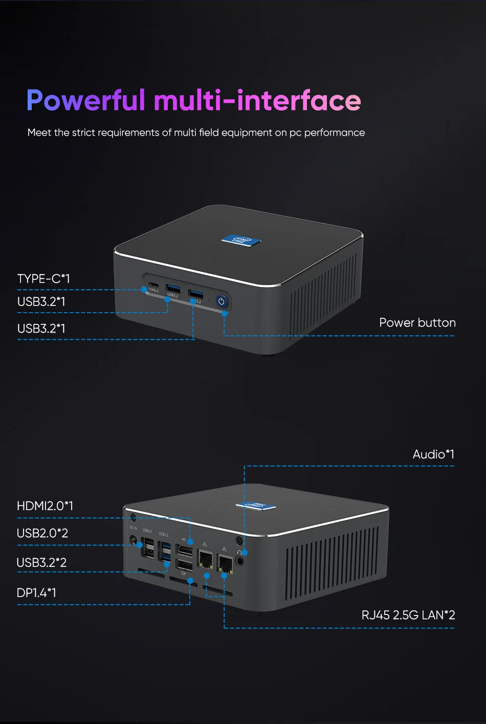 Rear I/O: 2 x USB 3.2, 2 x USB 2.0, 1 x HDMI2.0, 1 x DP1.4, 2 x 2.5G RJ45 LAN, 1 x Audio, 1 x DC-IN