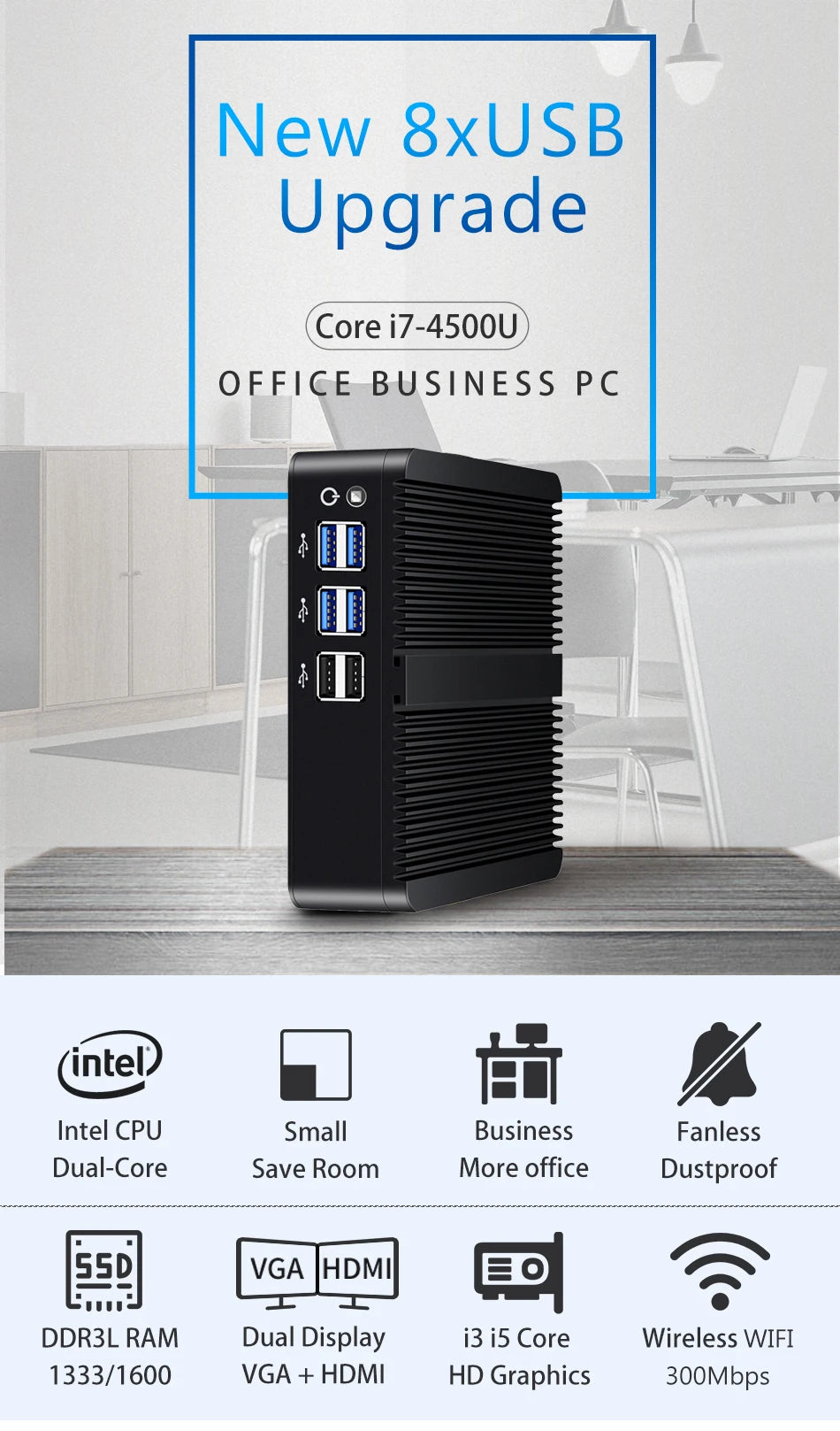 BEBEPC HTPC Fanless Mini PC Windows 10 Intel Core i3 5005U i5 4200U Celeron 2955U DDR3L WiFi HDMI 8*USB HTPC Office Mini Compute