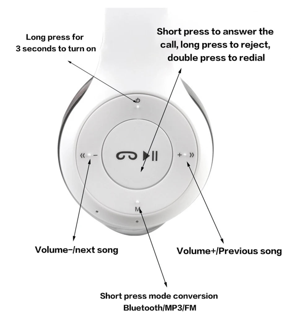 1. Features: Portable. 2. Function: Answering Phone, function, Microphone, Noise Cancelling, Song Switching, Sweatproof, Voice control, Voice Prompt, Waterproof. 3. Material: Metal, PC. 4. Model: P47. 5. Type: Over-ear. 6. Wearing type: Headband.